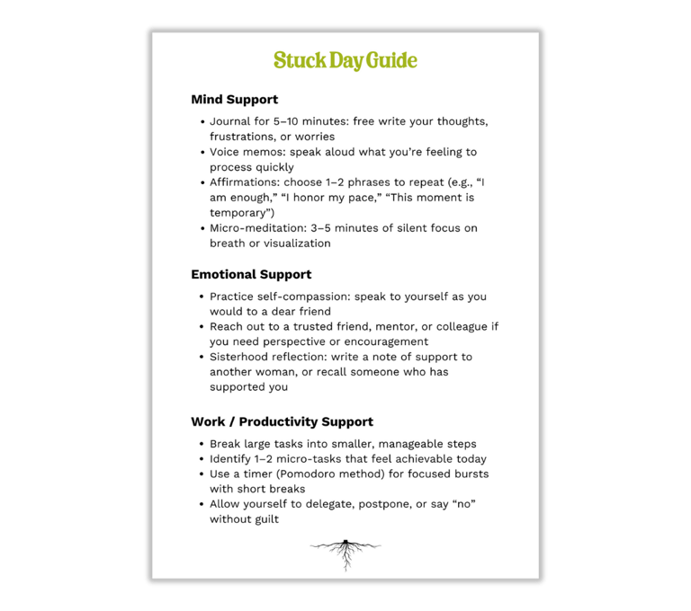 The Stuck Day Guide is a section inside The Evolved Working Woman Workbook that supports you when you feel overwhelmed, blocked, or disconnected. It’s a simple, repeatable practice that helps you reset — emotionally, mentally, and physically.